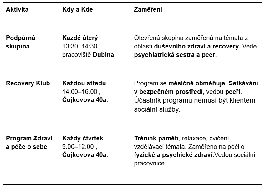 Sociální rehabilitaci můžete využít kdykoliv během provozních hodin (Po-čt: 7:00 - 16:00, Pá: 8:00 - 12:00) po předchozí domluvě, využijte, prosím, rezervační formulář nebo tel. 775 191 764. Pravidelné aktivity najdete v tabulce. Nadále se budeme potkávat na pracovištích Čujkovova 30 a Čujkovova 40a v Ostravě - Zábřehu a na J. Matušky na Dubině.